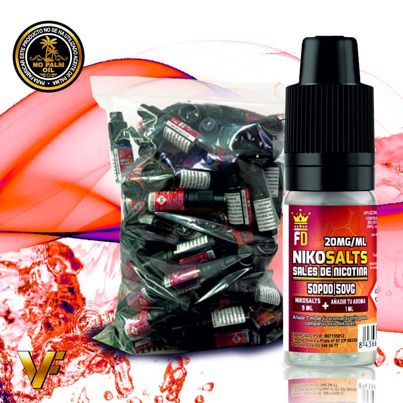 Nuestro NikoSalts contiene 9 ml de líquido 50/50 de 20mg de sales de nicotina para que puedas añadir 1 o 2 ml del aroma que más te guste. Así puedes obtener un líquido de 10ml de sales de nicotina hasta un resultado de 18mg.